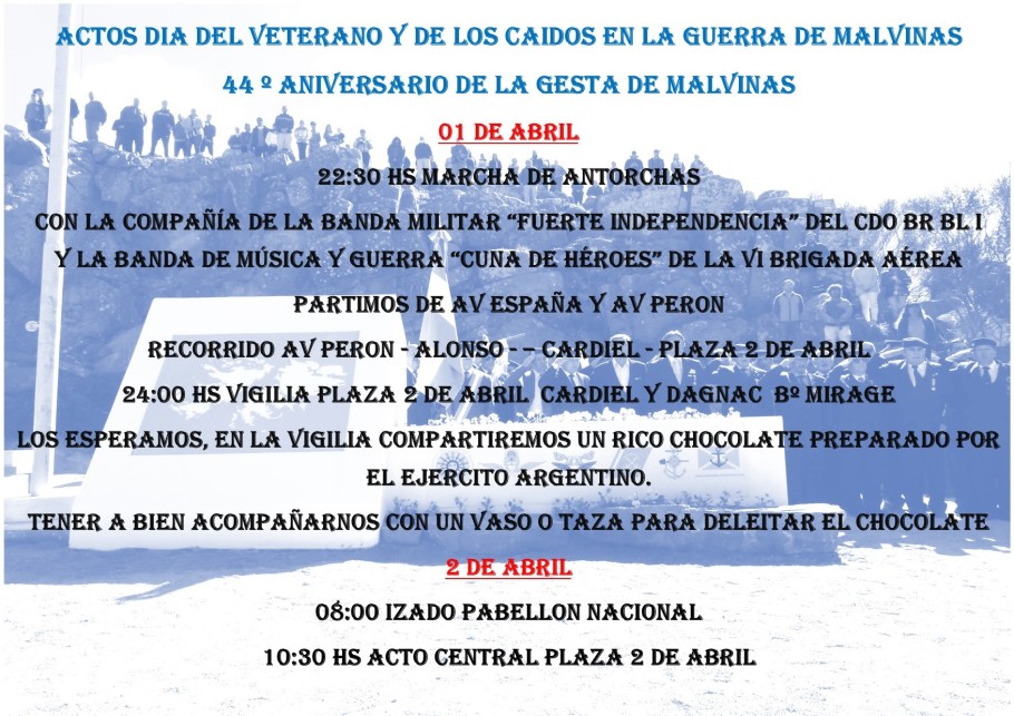 En el marco del 44º Aniversario de la Gesta de Malvinas, se desarrollarán, el miércoles por la noche y la mañana del jueves, los actos por el Día del Veterano y los Caídos en la Guerra.