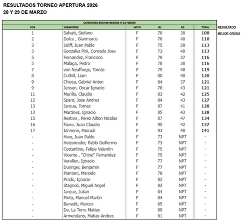 En la categoría scratch, el ganador fue Stefano Salvati con108 golpes gross. En la categoría 0 a 9 de hándicap, el ganador fue Francisco Fernández 108 golpes netos. Con 10 a 16 de hándicap, el ganador fue Oscar Rábago con 110 golpes netos. Con 17 a 24 de hándicap, Juan Trueba resultó ganador con 98 golpes netos y de 25 a 54 de hándicap Matías Vilanoba terminó en primer lugar con 101 golpes netos.
