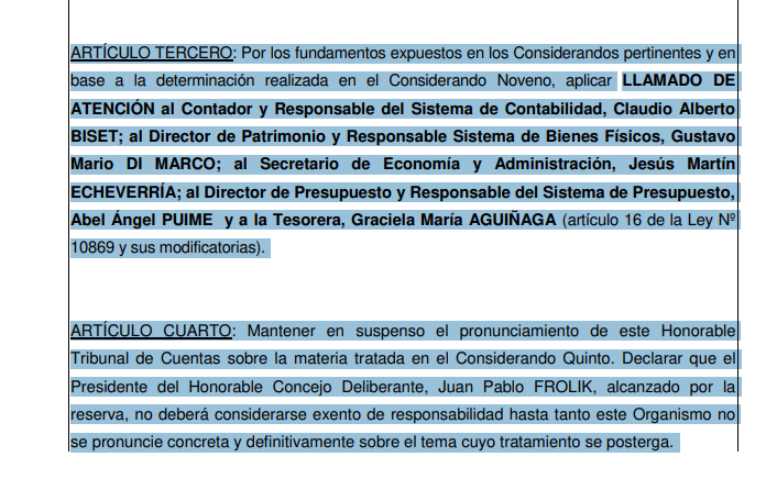 El Tribunal de Cuentas determinó que el mecanismo utilizado para modificar estas partidas no respetó el procedimiento administrativo previsto por la normativa presupuestaria, lo que derivó en observaciones formales sobre la forma en que el municipio corrigió la proyección del pasivo.