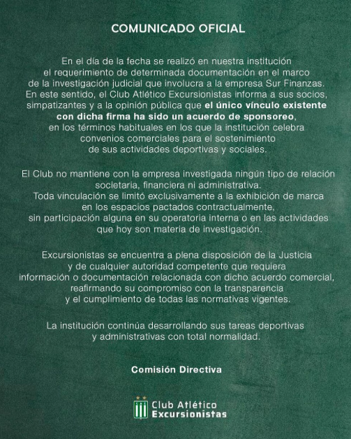 A continuación, el elenco del Bajo Belgrano aclaró que no hay "ningún tipo de relación societaria, financiera ni administrativa" con esa empresa y todo se limitó a la "exhibición de marca en los espacios pactados contractualmente". "Excursionistas se encuentra a plena disposición de la Justicia y de cualquier autoridad competente que requiera información o documentación relacionada con dicho acuerdo comercial, reafirmando su compromiso con la transparencia y el cumplimiento de todas las normativas vigentes", concluyeron.