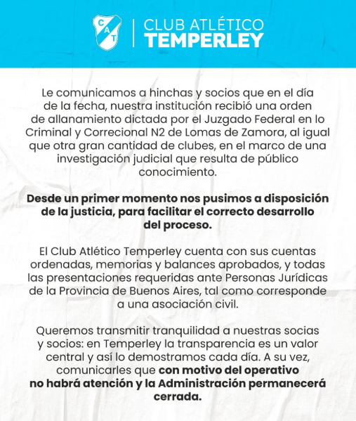 Por otro lado, Temperley también acusó recibo de la orden de allanamiento. El Gasolero expresó que "cuenta con sus cuentas ordenadas, memorias y balances aprobados, y todas las presentaciones requeridas ante Personas Jurídicas de la Provincia de Buenos Aires, tal como corresponde a una asociación civil". "Queremos transmitir tranquilidad a nuestras socias y socios: en Temperley la transparencia es un valor central y así lo demostramos cada día", sentenciaron.